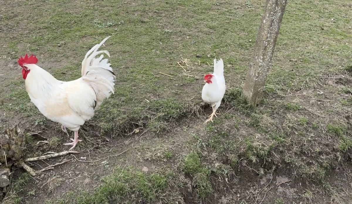 My wife recently got a rooster to help look after her flock, and it's a fucking beast! For reference, the one behind is a fully grown, normal size hen. I swear it's a goose in disguise! 🪿